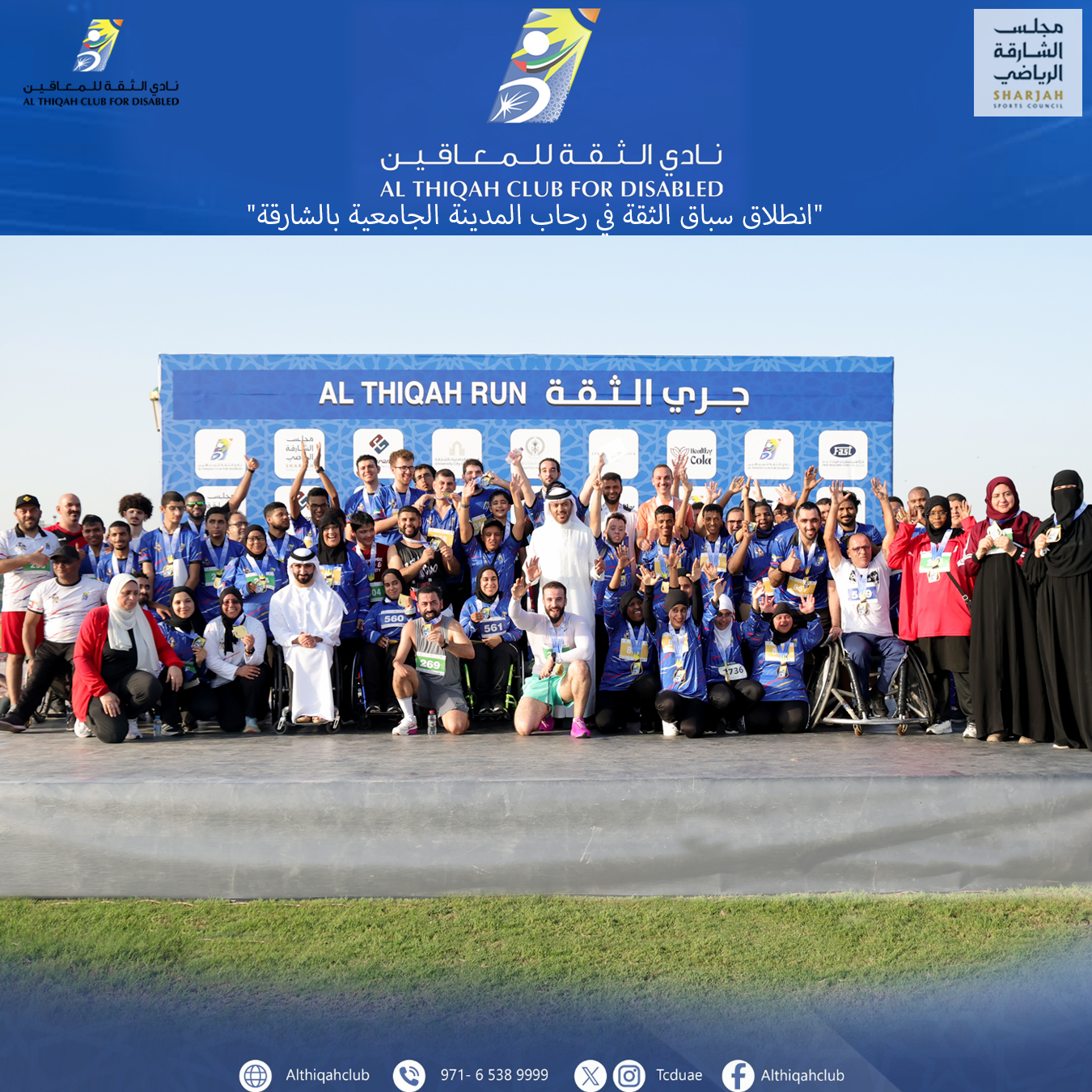 The launch was attended by His Excellency Dr. Khalid Omar Al Midfa, Chairman of the Board of Directors of the Al Thiqa Club for the Disabled; Mr. Mohammed Abdullah Al Qaid Al Hammadi, Acting Executive Director; Engineer Yousef Al Dobi, Board Member; and Mr. Abdullah Khalifa Al Shaer Al Suwaidi, Board Member. They gave the starting signal for the race, which included four distances: 10 km, 5 km, 3.2 km, and 1 km.
