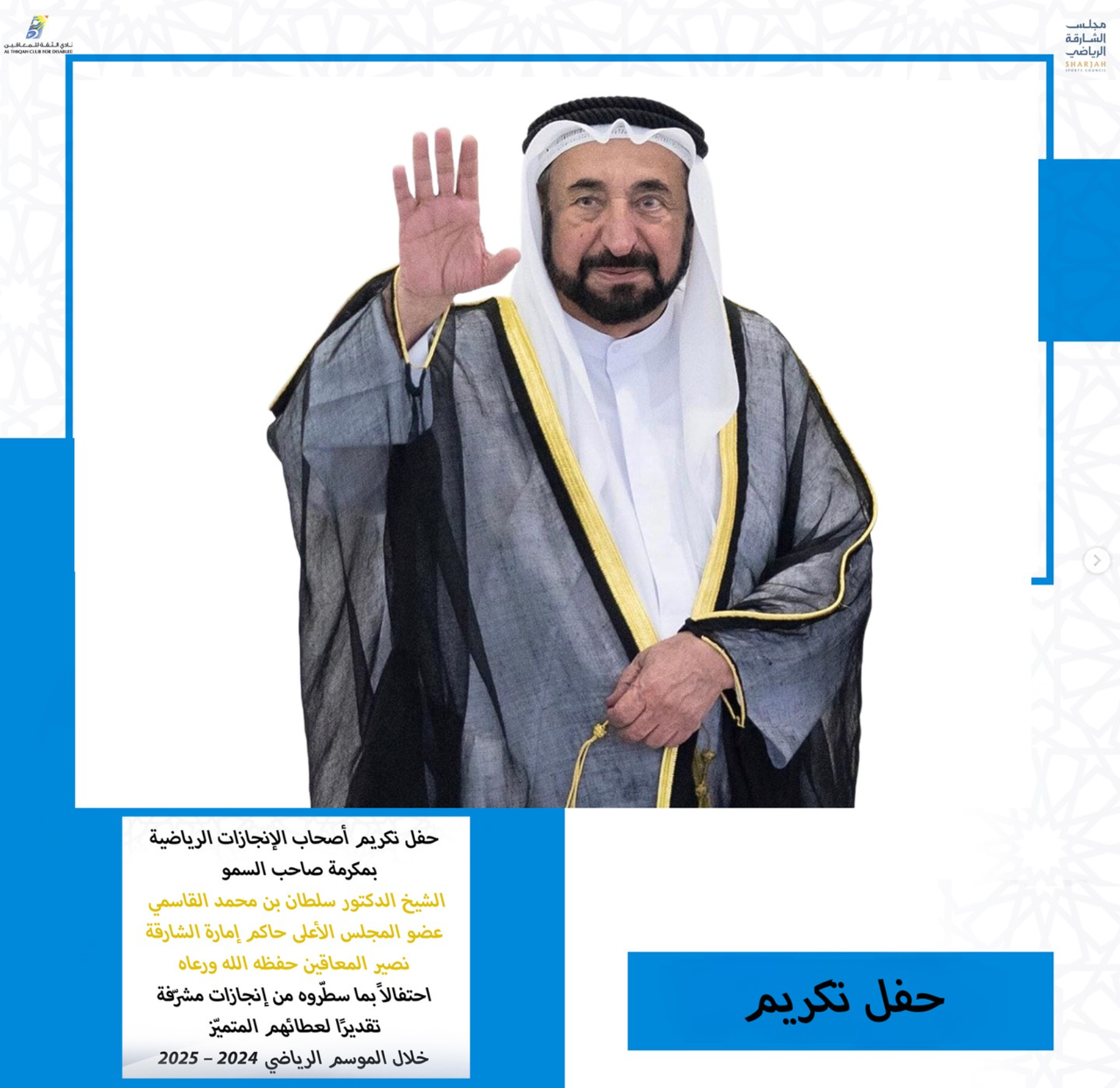 Al Thiqa Club for the Disabled held a ceremony to honor athletes who have achieved sporting success, thanks to a generous gift from His Highness Sheikh Dr. Sultan bin Muhammad Al Qasimi, Member of the Supreme Council and Ruler of Sharjah, may God protect him, in recognition of their efforts and honorable accomplishments.